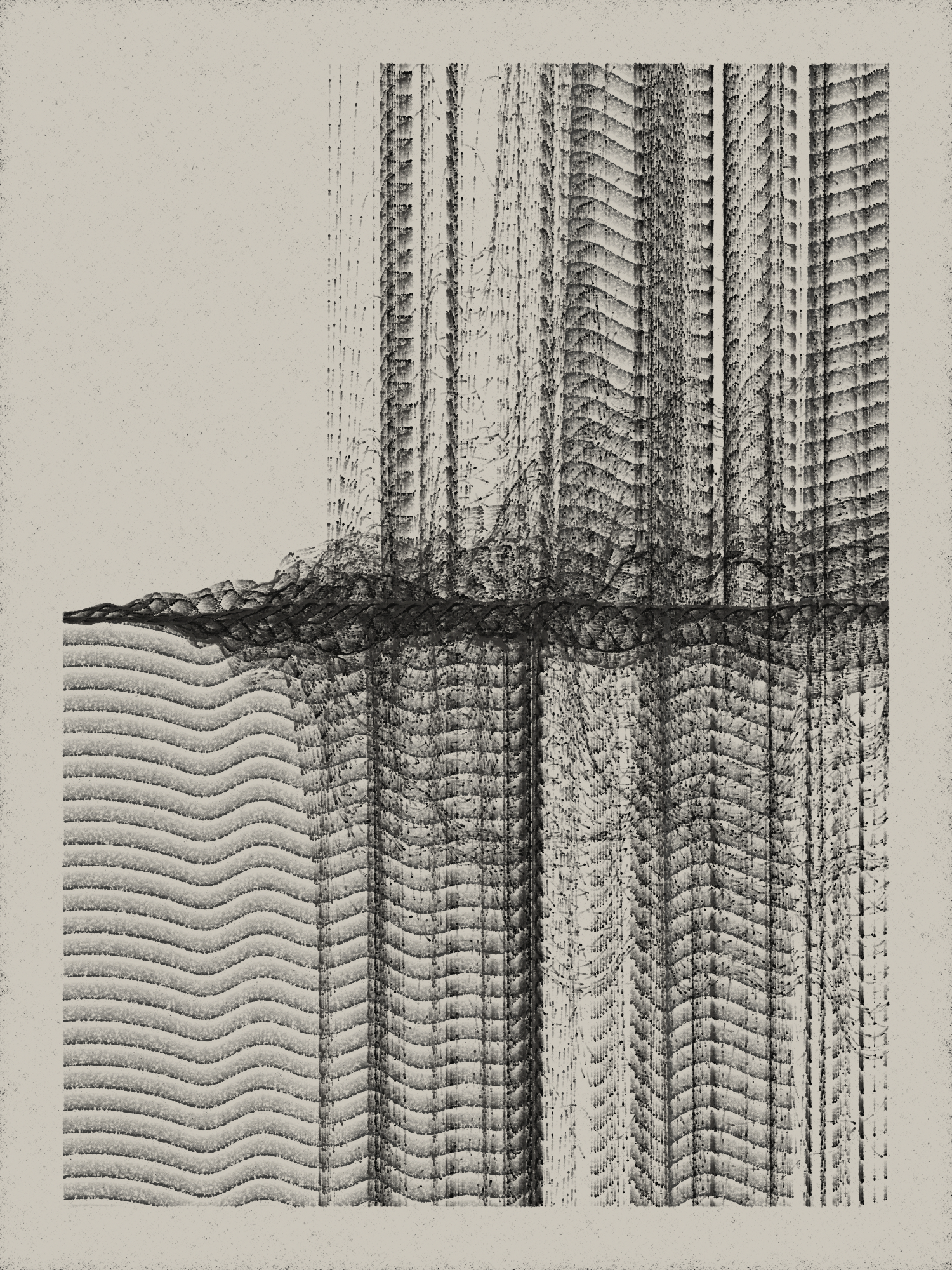 Udnē is a collection of asymmetric textural compositions. It's a search for creating harmonies and disharmonies by combining 3 colors with 3 unsynchronized mathematical equations. Udnē explores the beauty within triadic compositions while attempting to integrate two contrasting textures by forming instances of non-figurative scenes. The collection is a reflection of integrated and contrasting textures in micro and macro scale that we see in our everyday life environment.